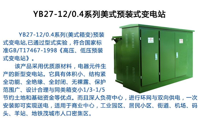 YB27-12/0.4預(yù)裝式變電站是產(chǎn)化美式箱變。該產(chǎn)品作為電纜化配電網(wǎng)中重要的供電單元,集高壓控制、保護、變電、以及配電設(shè)備于一體的成套預(yù)裝產(chǎn)品,廣泛應(yīng)用于城鄉(xiāng)配電網(wǎng)之中。