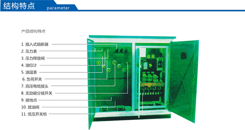 該產(chǎn)品將高壓負荷開關(guān)、高壓熔斷器置于變壓器油中,具有與變壓器器身共箱或分箱兩種結(jié)構(gòu)形式。油箱采用全密封結(jié)構(gòu),配有油溫表、油位表、壓力表、壓力釋放閥、放油閥等元件以監(jiān)測變壓器運行狀況。該產(chǎn)品分為環(huán)網(wǎng)型、終端型及電源型供電方式。為了使此種產(chǎn)品更適合于我電網(wǎng)的實際要求,公司又推了插拔型干式熔斷器,熔絲的熔斷不影響變壓器油的性能。根據(jù)低壓饋出要求的復(fù)雜程度,YBM-12/0.4型產(chǎn)品分為標準型、加強型和綜合型三種外殼形式,使用戶和設(shè)計單位在選型時,做到更靈活、更經(jīng)濟。